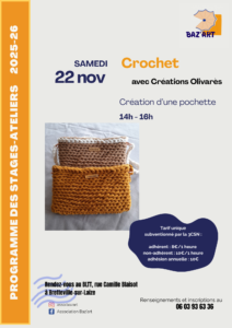 L’association Baz’art propose un stage d’initiation au crochet, le samedi 22 novembre 2025, avec Création Olivares