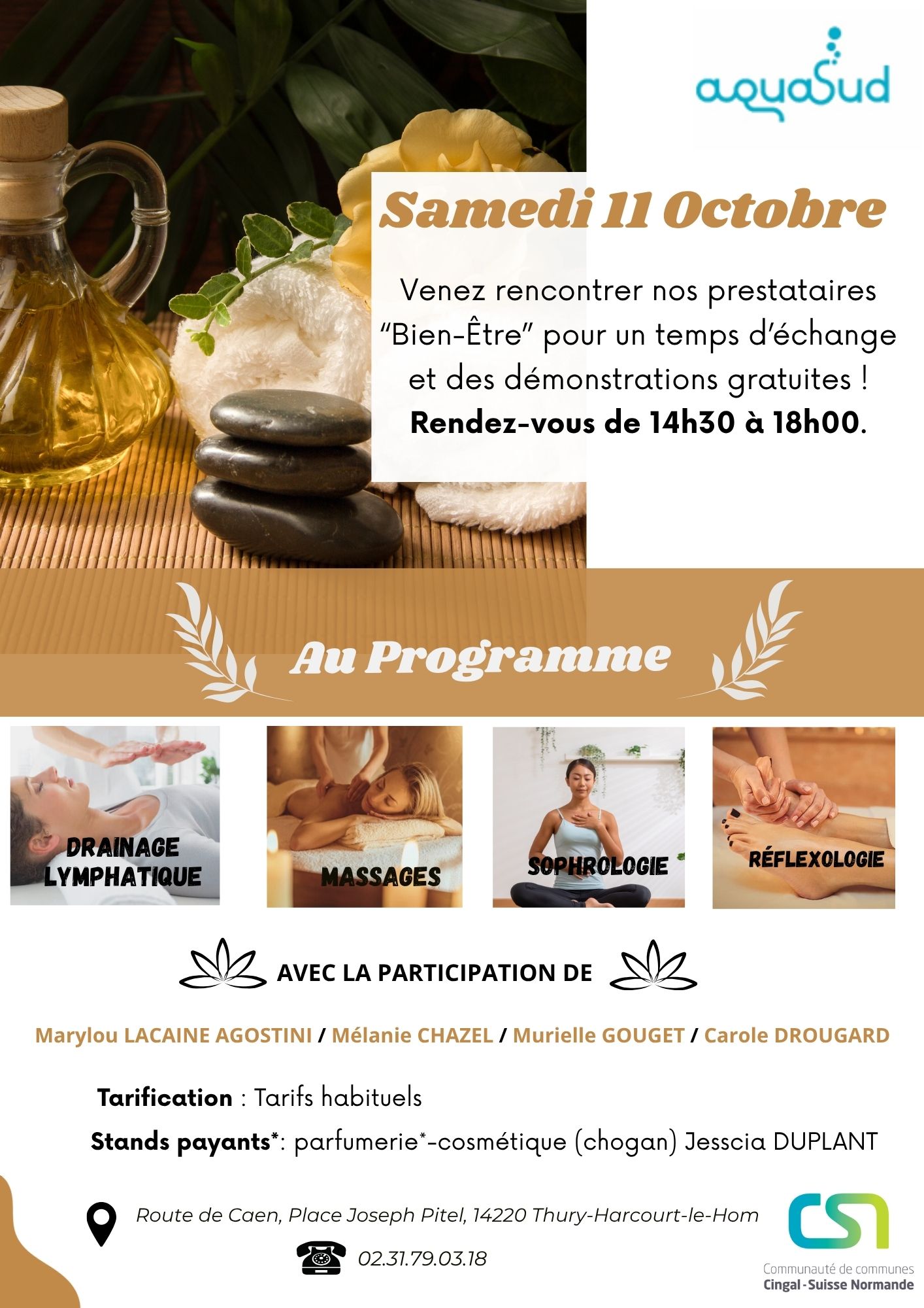 Le samedi 11 octobre, de 14h30 à 18h, le Centre Aquatique Aquasud à Thury-Harcourt-le-Hom vous invite à rencontrer ses partenaires bien-être.