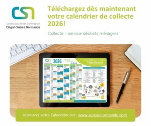 Les calendriers de collecte 2026 pour le ramassage des déchets en porte-à-porte sont à présent disponibles sur le site de la Communauté de communes Cingal–Suisse Normande, en version papier à la Maison de Services ou dans vos mairies, pendant les horaires d’ouverture.