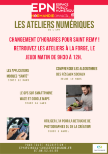 Afin de permettre au plus grand nombre de participer, les horaires des ateliers numériques (EPN) du jeudi à Saint-Rémy-sur-Orne évoluent au :