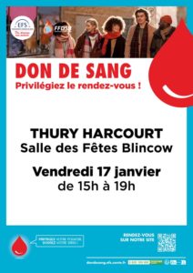 Et/ou bien à Thury-Harcourt-le-Hom le vendredi 17 janvier de 15h à 19h à la Salle des fêtes Blincow (près de la mairie) : https://efs.link/f2eTU