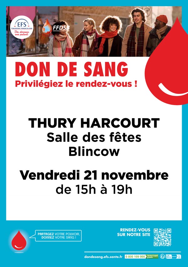 Rendez-vous vendredi 21 novembre de 15h à 19h à la Salle Blincow de Thury-Harcourt-le-Hom et organisez votre venue en vous rendant sur le site https://efs.link/6hy4E