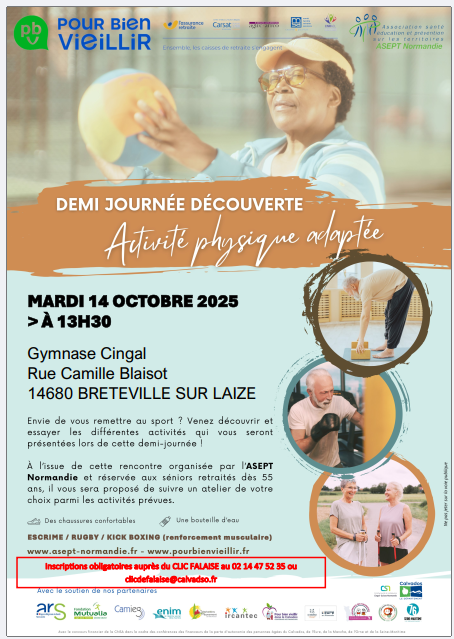 Le 14 octobre à partir de 13h30, venez découvrir et essayer les activités sportives réservées aux seniors au Gymnase, rue Camille Blaisot, à Bretteville-sur-Laize.