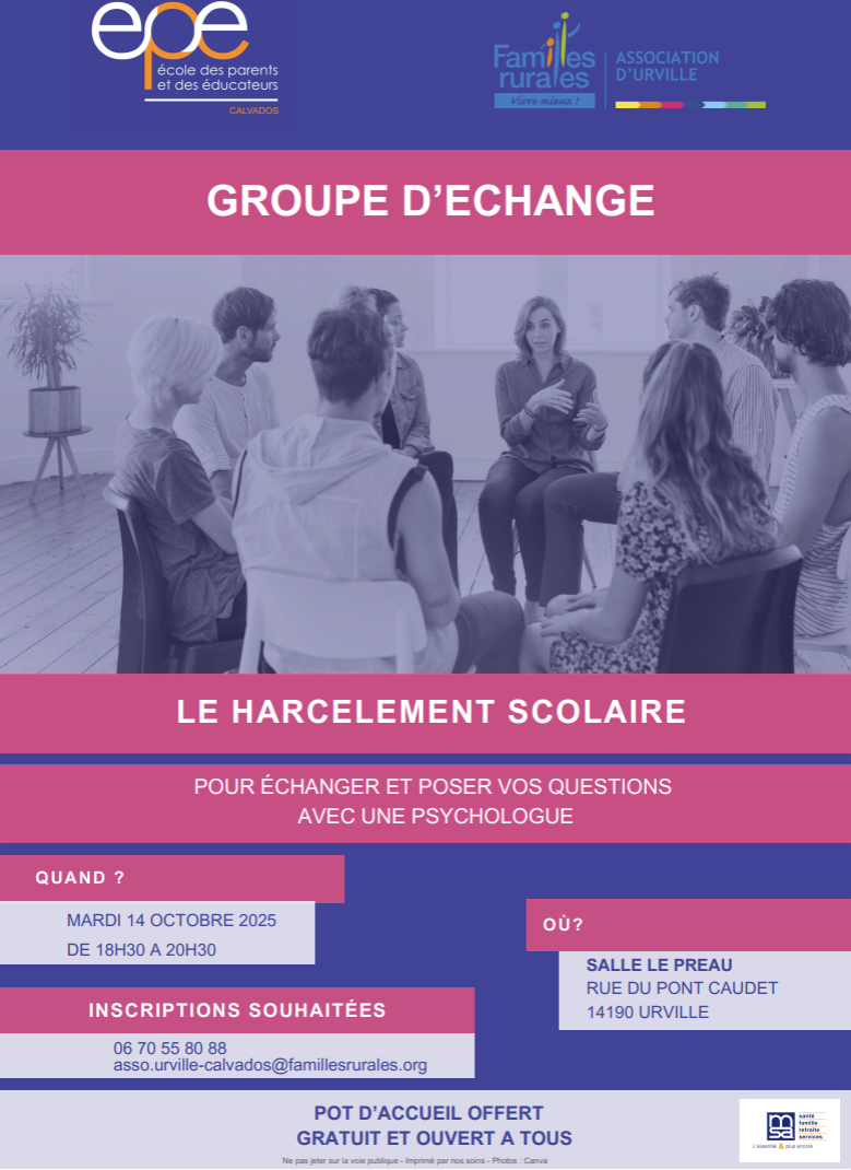 Familles Rurales Urville vous invite à une soirée d’information et d’échanges autour de la parentalité en partenariat avec l’École des parents et éducateurs du Calvados, le soutien de la Mutualité sociale agricole en présence d’une psychologue.