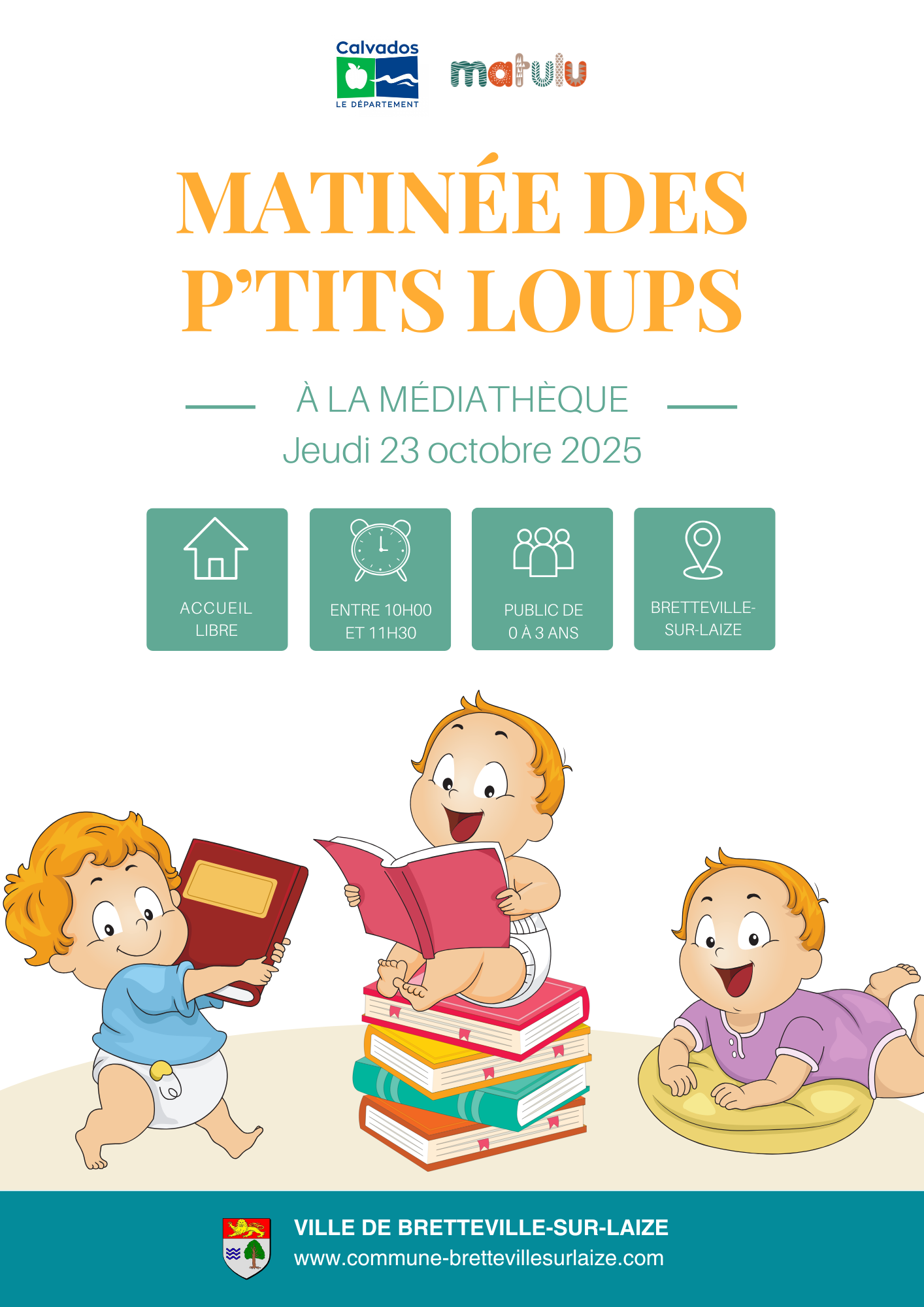 Retrouvez-nous jeudi 23 octobre 2025 de 10h à 11h30, la Médiathèque de Bretteville-sur-Laize ! La matinée des p’tits loups est une animation gratuite et ludique pour éveiller les tout-petits à la lecture, dans une ambiance chaleureuse et conviviale.