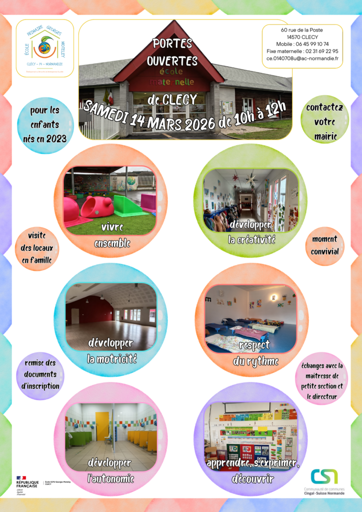 Le directeur de l’école Georges Moteley à Clécy vous informe qu’un premier temps d’échanges et de visite de l’école maternelle sera organisé le samedi 14 mars pour les futurs élèves de Petite Section.