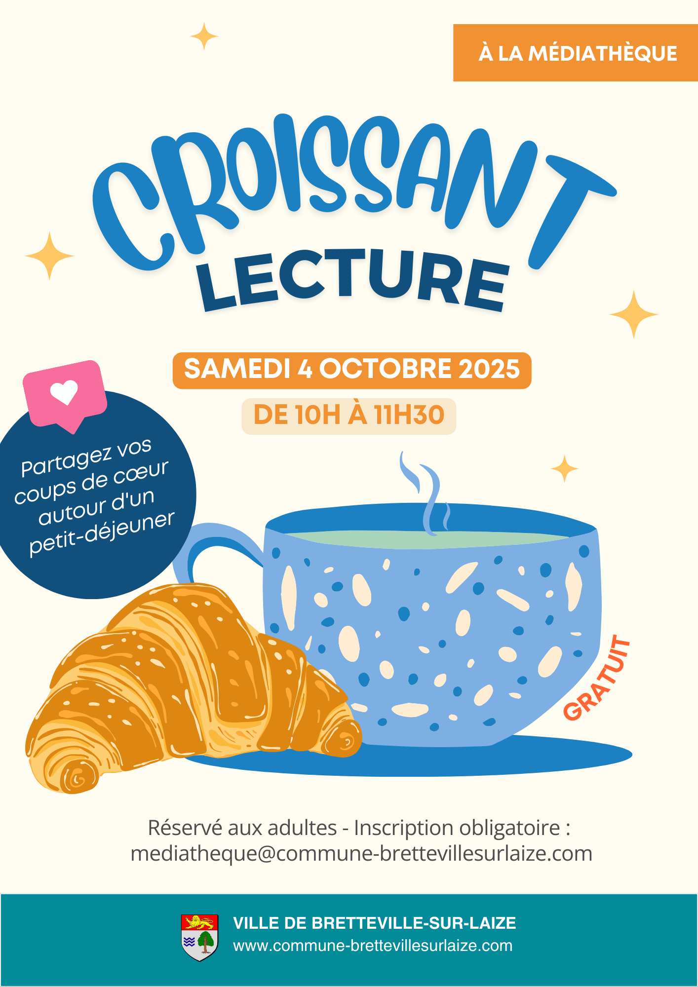 Venez participer à l’animation “Croissant Lecture” organisée à la Médiathèque de Bretteville-sur-Laize, le samedi 4 octobre 2025, de 10h00 à 11h30 📚